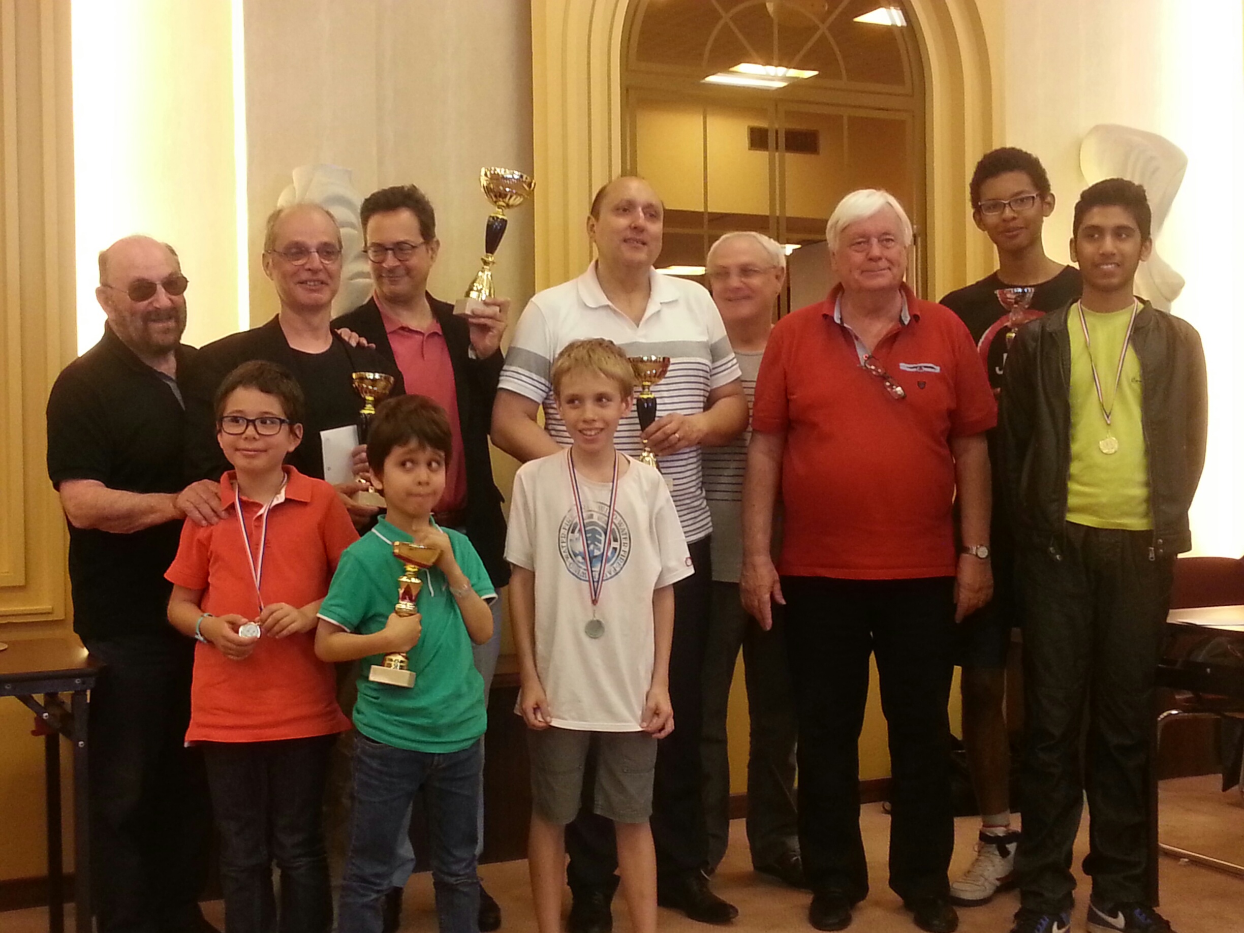 Yves Marek, sur un nuage, a remporté avec le score parfait de 7/7 le 2e Trophée Benno Feingold qui s’est déroulé aux Pyramides de Port Marly le samedi 25 juin. Cela vient clôturer une saison à l’actualité très riche ou Benno Feingold et Guy Roché doivent une nouvelle fois être remerciés d’être aussi impliqués pour accompagner Le Grand Echiquier. Un nom a retenir : Marco Materia qui n’est que petit-poussin et qui a réalisé 4/7 alors qu’il avait 4/5 (défaites face au 2 premiers). Vous noterez qu’il a le meilleur départage !